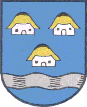 Beschreibung: In blau über einen silbernen Wellenbalken im Schildfuss drei (2 + 1) silberne Bauernkaten mit goldenem Dach